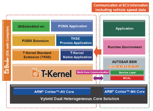 eSOL has ported to the Cortex-M4 core the AUTOSAR basic software (BSW) of the AUTOSAR methodology support tool "eSOL ECUSAR," and in a sample application, implemented the feature of retrieving the vehicle information from the ECU via the CAN communication. In the future, eSOL ECUSAR, which can automatically generate AUTOSAR BSW, will be optimized to fully support the Vybrid devices and made commercially available according to market needs. As for multimedia applications on the ARM Cortex-A5 core, eSOL T-Kernel-based software platform "eCROS" has been implemented, which integrates various middleware and development tools on the real-time OS "eT-Kernel" - a successor of TRON architecture. eCROS has been adopted in a wide range of automotive information systems, including car navigation systems, car audio devices, drive recorders and around-vehicle monitors, and it supports a linkage technology for car navigations systems and smartphones. Moreover, the sample application helps establish communication between an ARM Cortex-A5 core and an ARM Cortex-M4 core; therefore, the vehicle information retrieved in one application can be shared with the other (see Figure 1). In the future, features necessary for driver information systems, such as a sophisticated graphics capability, will be added to further evolve the software platform.