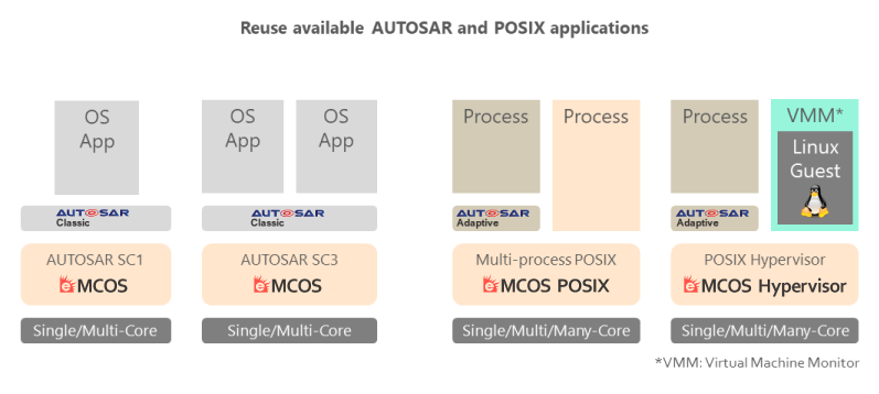 eMCOS 具有不同的配置,例如多进程 POSIX 和 AUTOSAR(SC1 和 SC3)。它还为混合临界应用程序提供Hypervisor功能选项。