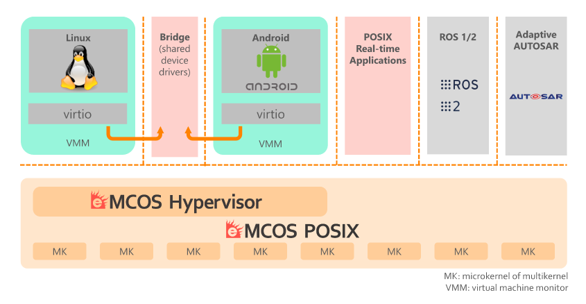eMCOS Hypervisor作为eMCOS POSIX 的扩展功能选项, 这意味着 eMCOS POSIX 的实时和安全关键型应用可以与 Linux 和 Android 客户机操作系统一起部署在同一硬件平台上。