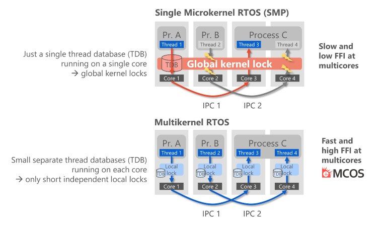 使用传统的(单个)微内核 RTOS,不同内核之间的每次通信都会停止所有内核,因为该架构的确定性仅基于单个线程数据库。这意味着用户应用必须处理全局内核锁,这会产生复杂的应用行为。