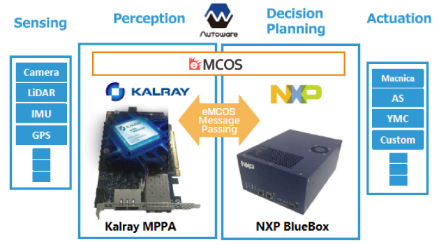 - 拥有 80 个内核的 Kalray 的 MPPA Coolidge 众核处理器负责AI 加速器用于感知功能,NXP Semiconductors 的 BlueBox 主板处理 则负责运行Autoware 的进程。